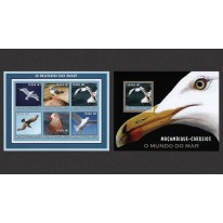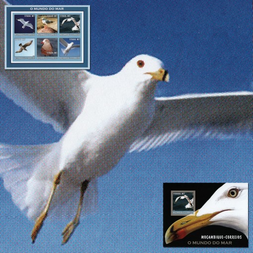 Seria w arkuszu i blok, na znaczkach których widnieją różne gatunki mew.
