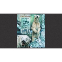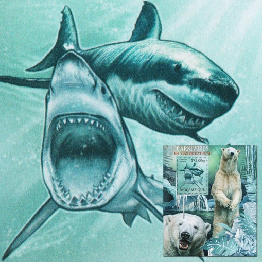 Znaczek w bloku, na którym widnieją rekiny żarłacze białe.