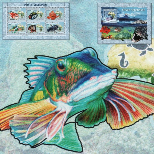 Seria w arkuszu i blok, na znaczkach których widnieją gatunki trujących ryb z rodziny kolejno: skorpenowatych, rogatnicowatych, antenariusowatych, kurkowatych i Thassophryninae, a także gatunek Hydrocynus goliath i żabnica.