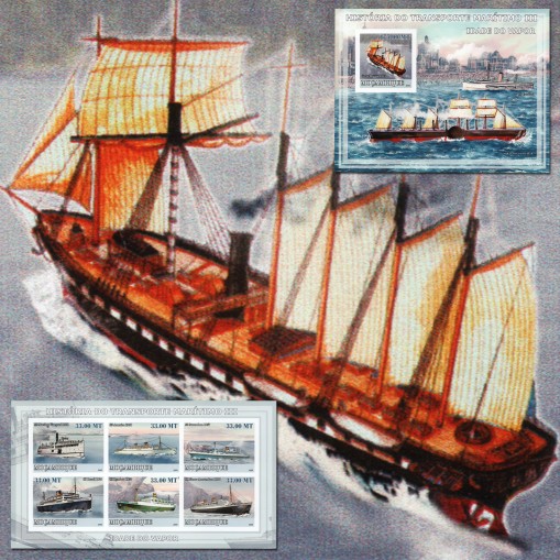 Seria w arkuszu i blok z cyklu przedstawiającego historię transportu morskiego.
