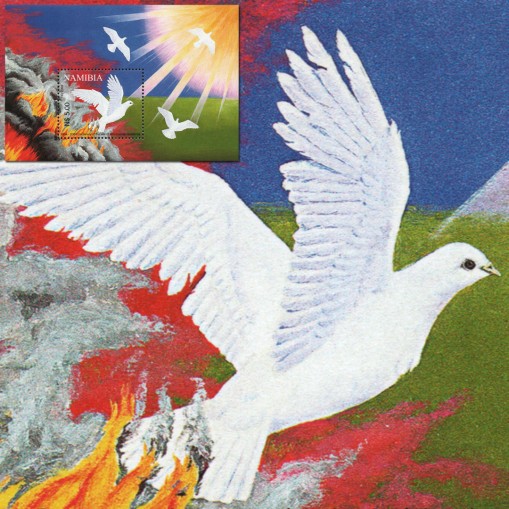 Na znaczku widnieje biały gołąb uciekający przed pożarem.