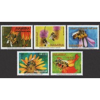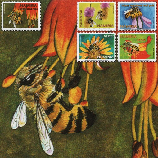 Na znaczkach widnieje afrykańska pszczoła miodna (apis mellifica scutellata) odwiedzająca następujące gatunki kwiatów występujące w Namibii: