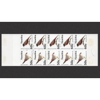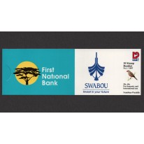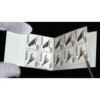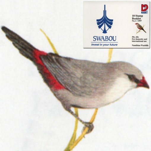 Znaczki obiegowe w zeszyciku filatelistycznym, na których widnieją następujące gatunki ptaków z podrodziny astryldów występujące w Namibii: