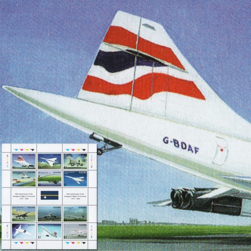 Seria w arkuszu upamiętniająca 30. rocznicę pierwszych lotów rejsowych samolotu Concorde.