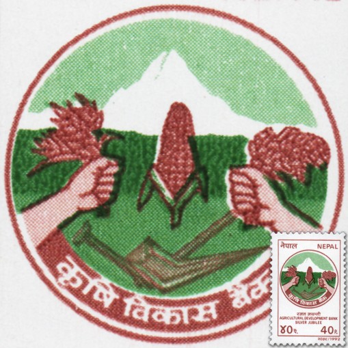 Znaczek upamiętniający 25. rocznicę powstania Nepalskiego Banku Rozwoju Rolnictwa.