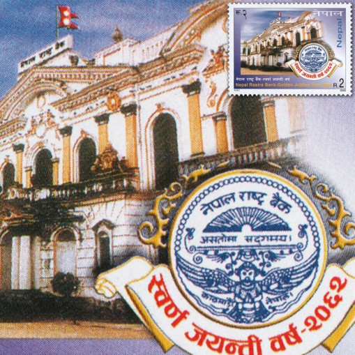 Znaczek upamiętniający 50-lecie istnienia centralnego banku nepalskiego - Nepal Rastra Bank.