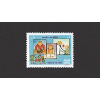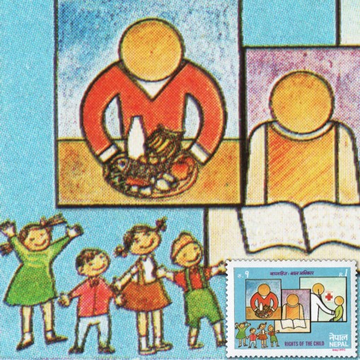 Na znaczku przedstawiono prawa dziecka do pełnowartościowego wyżywienia, edukacji i opieki zdrowotnej.