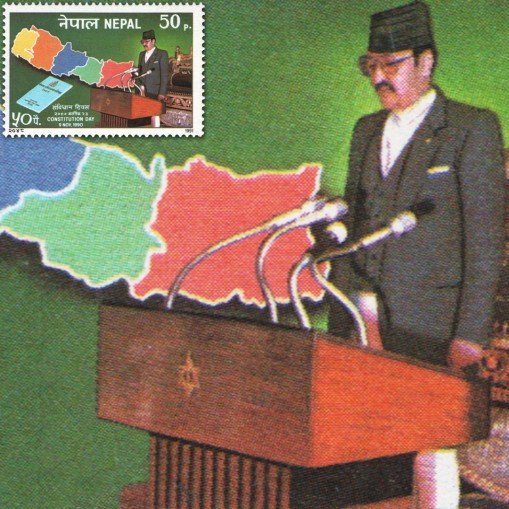 Na znaczku widnieje król Birendra wygłaszający przemówienie oraz mapa Nepalu.