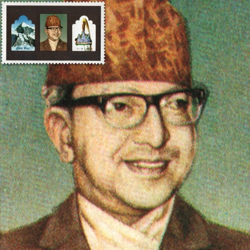 Na znaczku monarcha ten widnieje obok góry i korony nepalskiej.
