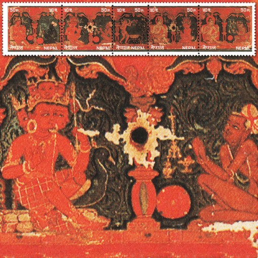 Na znaczkach w pasku widnieje ilustracja z okładki 13. wiecznego tekstu hinduistycznego "Śiwa Purana".