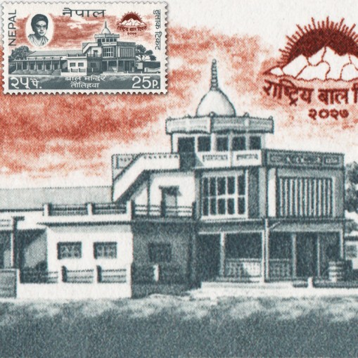Na znaczku widnieje pałac dzieci w Taulihawa oraz królowa Ratna.
