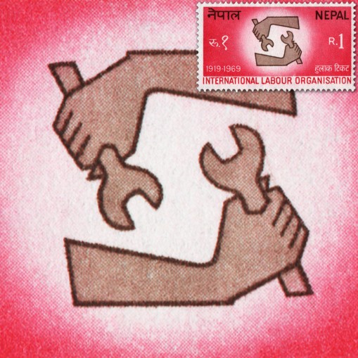 Znaczek upamiętniający 50. rocznicę powstania Międzynarodowej Organizacji Pracy.