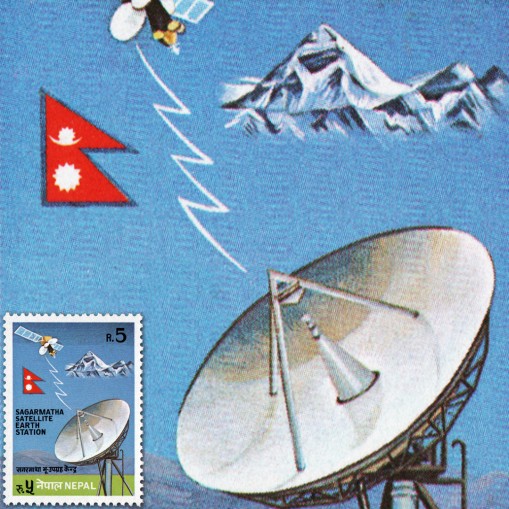 Na znaczku widnieje satelita Intelsat V oraz antena satelitarnej stacji naziemnej Sagarmatha w Balambu.