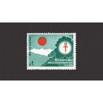 Na znaczku widnieje słońce, egipski krzyż Ankh i krajobraz nepalski.