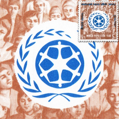Znaczek upamiętniający Światowy Rok Ludności. Widnieje na nim jego logo.