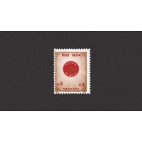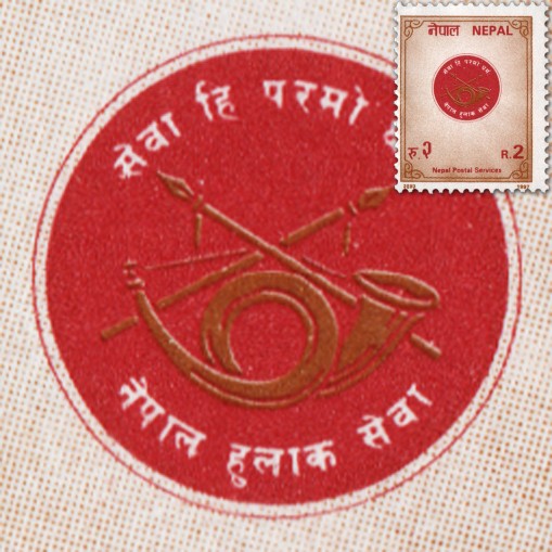 Znaczek obiegowy, na którym widnieje logo nepalskiej poczty - trąbka pocztowa i dwie włócznie.