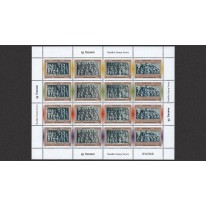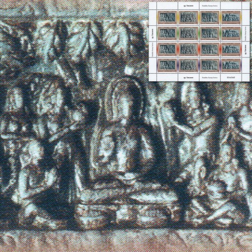 Na znaczkach w arkuszu widnieją płaskorzeźby przedstawiające sceny z życia Buddy, kolejno: narodziny, oświecenie, pierwszą przemowę i mahaparinirvanę.
