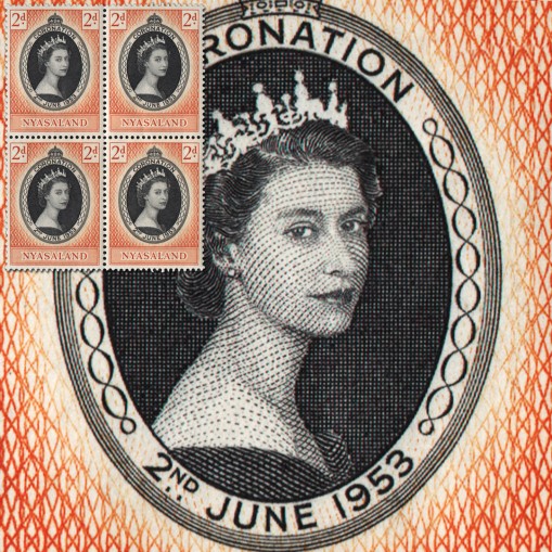 Znaczek w czwórce upamiętniający koronację Elżbiety II.