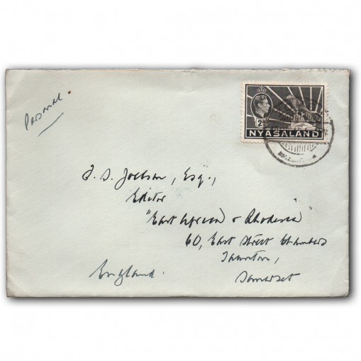Koperta została zaadresowana z Zomba w Niasie do Taunton w brytyjskim hrabstwie Somerset.