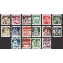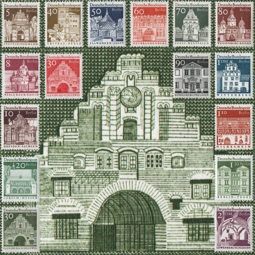 Na znaczkach widnieją słynne niemieckie budynki z ostatnich dwunastu wieków, kolejno: