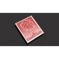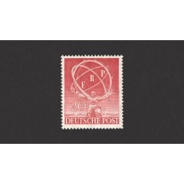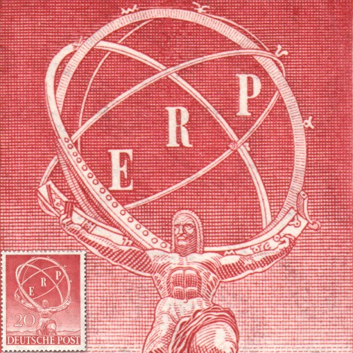 Znaczek upamiętniający otwarcie Niemieckich Targów Przemysłu i uchwalenie Programu Odbudowy Europy, znanego jako Plan Marschalla. Na znaczku przedstawiono rzeźbę Atlasa dźwigającego na swoich barkach glob ziemski.