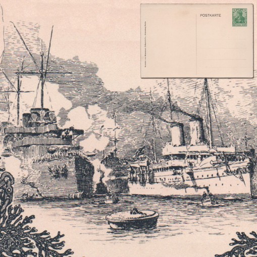 Na odwrocie kartki widnieją statki w porcie, wśród nich królewski jacht SMS „Hohenzollern”.
