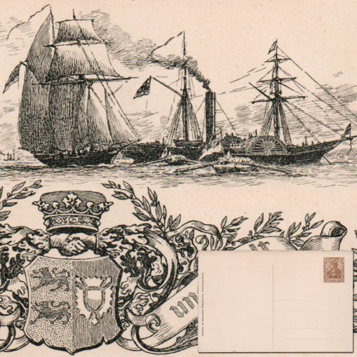 Na odwrocie kartki widnieją statki w porcie w Szlezwiku-Holsztynie w latach 1848-1850.