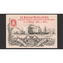 Kartka pocztowa z nadrukowanym znaczkiem o nominale 3Pf upamiętniająca 22. Niemiecki Dzień Filatelistów i promująca spotkanie filatelistów, które miało miejsce 12.-16.8.1910 w Kilonii.