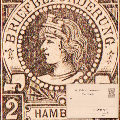 Kartka pocztowa z nadrukowanym znaczkiem, na którym widnieje głowa Hammonii - personifikacji miasta Hamburga.