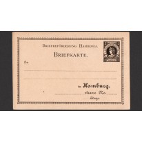 Kartka pocztowa z nadrukowanym znaczkiem, na którym widnieje głowa Hammonii - personifikacji miasta Hamburga.