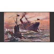 Na kartce widnieje brytyjski parowiec handlowy zatopiony przez niemiecką łódź podwodną. Jest to obraz niemieckiego malarza marynistycznego Willy’ego Stöwera (1864-1931).