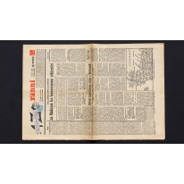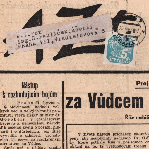 Dwie pierwsze strony gazety „A-Zet ranní” wydanej 28. lipca 1944 roku w Protektoracie Czech i Moraw. W lewym górnym rogu strony tytułowej widnieje znaczek gazetowy wydany w 1943 roku i służący jako opłata za doręczenie prasy. Na znaczku przedstawiono gołąbka z gałązką lipy w dziobie (lipa uznawana jest za narodową roślinę Czechów i Słowaków). Adresatem gazety jest inżynier C. Pauliček (księgowy), ulica Vladislavova 6 w Pradze.