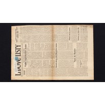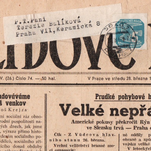 Dwie pierwsze strony gazety „Lidové listy” wydanej 28. marca 1945 roku w Protektoracie Czech i Moraw. W lewym górnym rogu strony tytułowej widnieje znaczek gazetowy wydany w 1943 roku i służący jako opłata za doręczenie prasy. Na znaczku przedstawiono gołąbka z gałązką lipy w dziobie (lipa uznawana jest za narodową roślinę Czechów i Słowaków). Adresatem gazety jest pani Terezie Balíková, ulica Keramická 8 w Pradze.