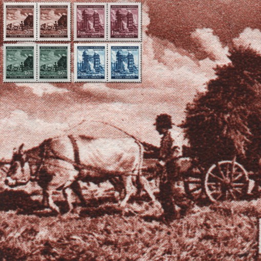 Na znaczkach widnieją przedstawienia rolnictwa i przemysłu: woły ciągnące wóz z sianem i piec hutniczy.