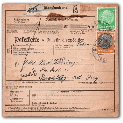 Paczka została wysłana z Ebersbach an der Fils w Badenii-Wirtembergii do Pardubic w dzisiejszych Czechach (ówczesny Protektorat Czech i Moraw) 28. lipca 1940 roku.