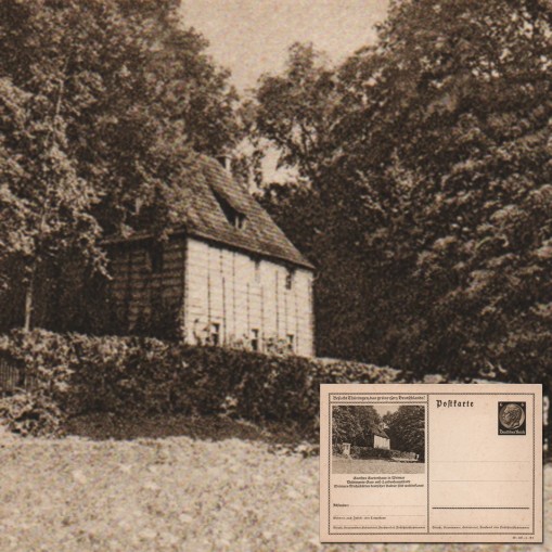 Po lewej stronie przedstawiono domek ogrodowy Goethego w Weimarze (numer wzoru kartki: 39–127-1-B1).