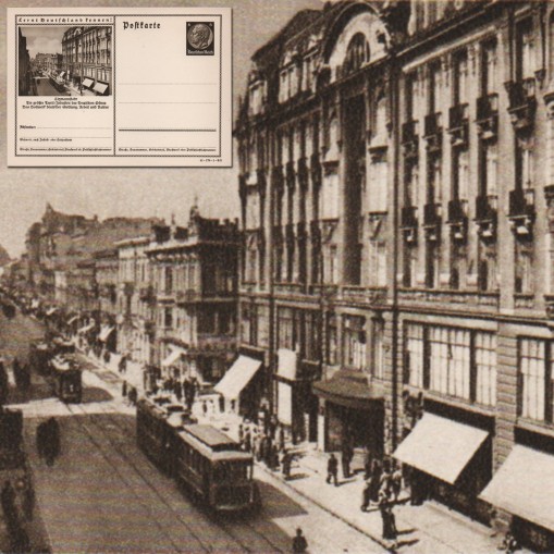 Po lewej stronie przedstawiono ulicę w Łodzi (niem. Litzmannstadt, nazistowska nazwa nadana miastu 11 kwietnia 1940 na rozkaz Adolfa Hitlera) (numer wzoru kartki: 41–179-1-B2).