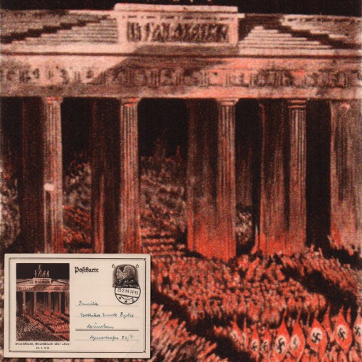 Po lewej stronie kartki widnieje marsz pod bramą Brandenburską w Berlinie 30. stycznia 1933 roku.