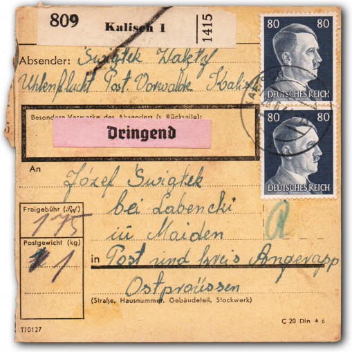 Paczka została wysłana z Kalisza (nim. Kalisch) do Darkiejm (ros. Oziorsk) w dzisiejszym obwodzie kaliningradzkim (których nazwę w 1938 zmieniono na Angerapp) 28. czerwca 1944 roku. Nadawcą był Walęty Świątek (sic), a adresatem Józef Świątek. Karta posiada adnotację „pilne” (niem. „dringend”).