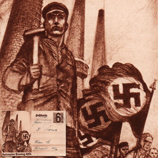 Po lewej stronie kartki widnieje robotnik z młotem na tle trzech kominów i ludzi z flagami NSDAP.