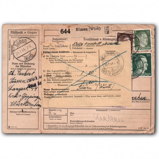 Paczka została wysłana z Süssen w Badenii-Wirtembergii do Rzeszowa 24. stycznia 1944 roku.
