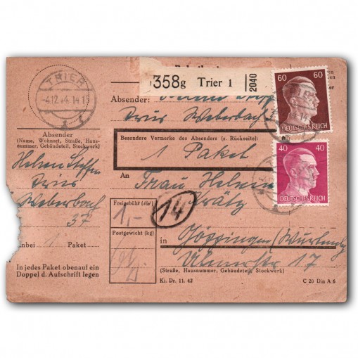 Paczka została wysłana z Trier w Nadrenii-Palatynacie do Göggingen w Badenii-Wirtembergii 4. grudnia 1944 roku.