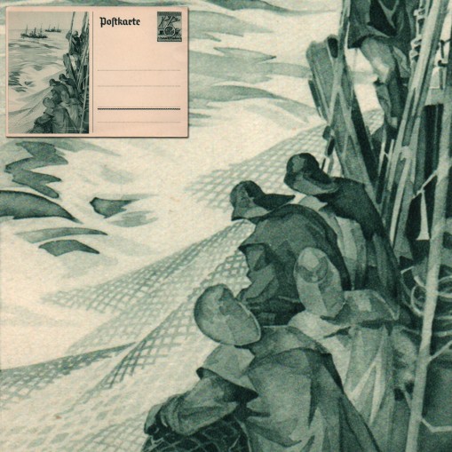 Po lewej stronie kartki widnieją rybacy na statku zarzucający sieci.
