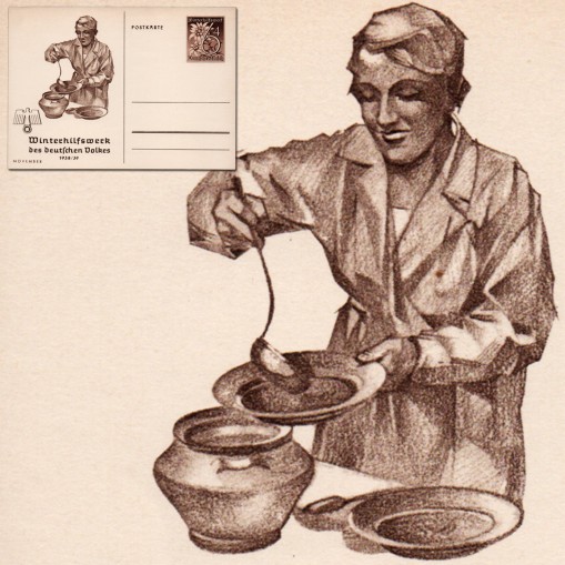 Po lewej stronie kartki widnieje kobieta nalewająca zupę.