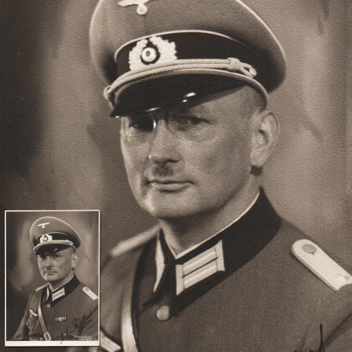 Czysta kartka pocztowa wydana podczas drugiej wojny światowej i przedstawiająca oficera Wehrmachtu. Na kartce widnieje autentyczny (nie kopiowany) autograf sportretowanego żołnierza i data 15.5.38.