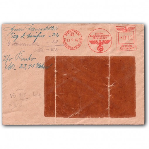 Koperta z pieczątką Państwowego Towarzystwa Ubezpieczeniowego Bawarii Górnej (niem. Landesversicherungsanstalt Oberbayern) wysłana z Monachium dnia 13. lipca 1942 roku.