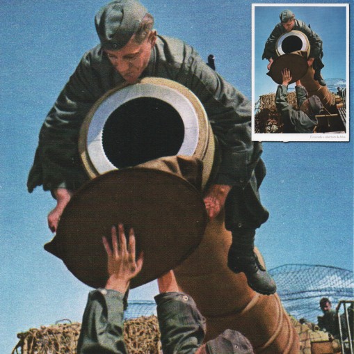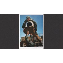 Czysta kartka pocztowa przedstawiająca żołnierzy zdejmujących osłonę z lufy działa.