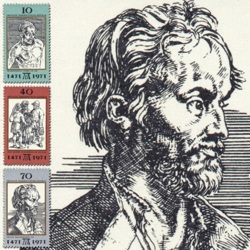 Na znaczkach widnieją jego rysunki i ryciny: autoportret, trzej chłopi i portret Filipa Melanchtona.