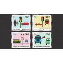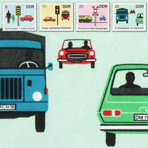 Na znaczkach widnieją kolejno: przejście dla pieszych, światła drogowe, przejazd kolejowy i wyprzedzający samochód.