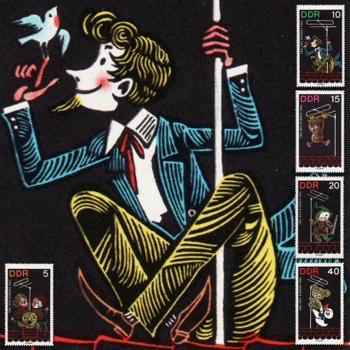 Na znaczkach widnieją bohaterowie enerdowskich bajek telewizyjnych.